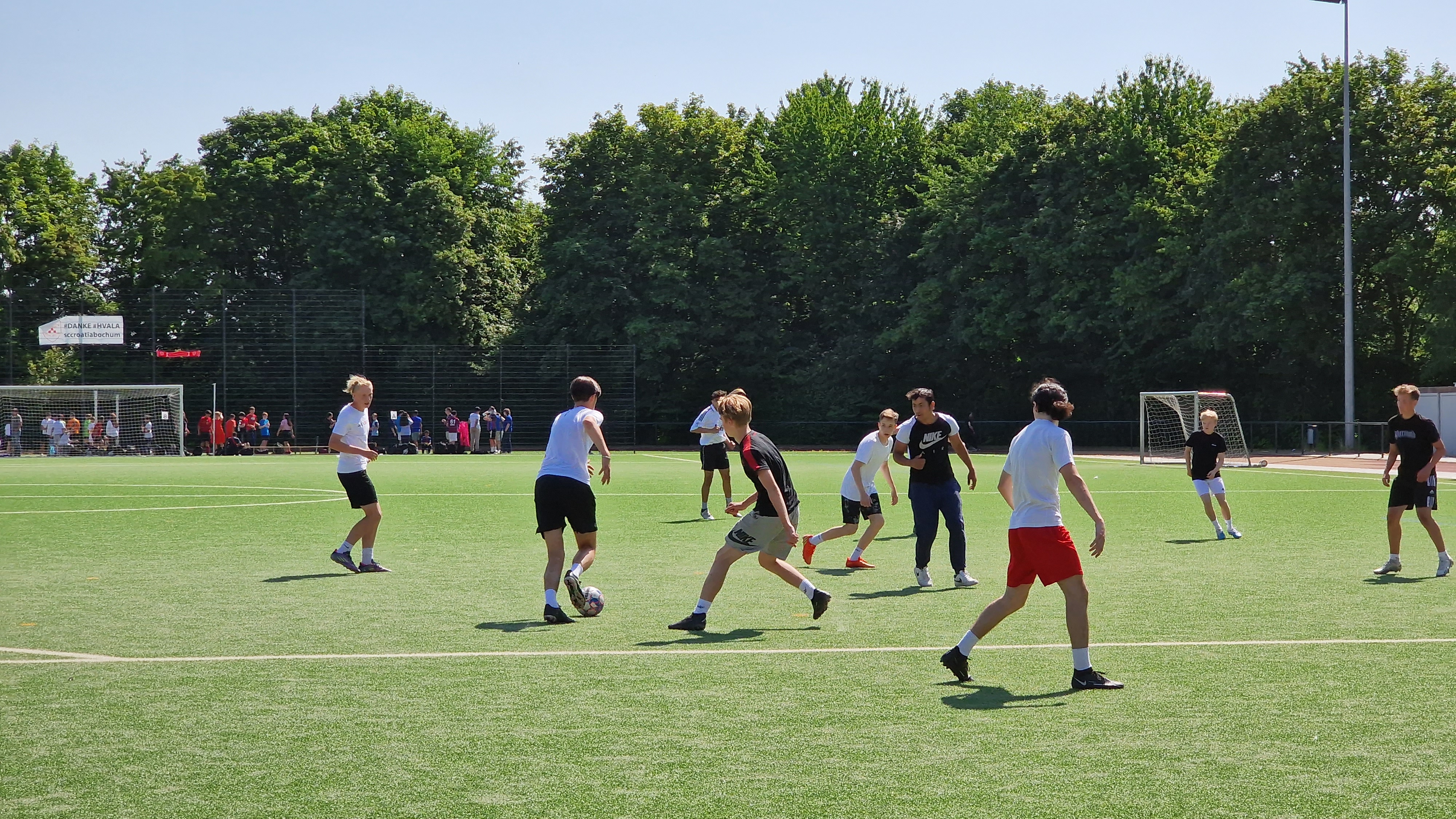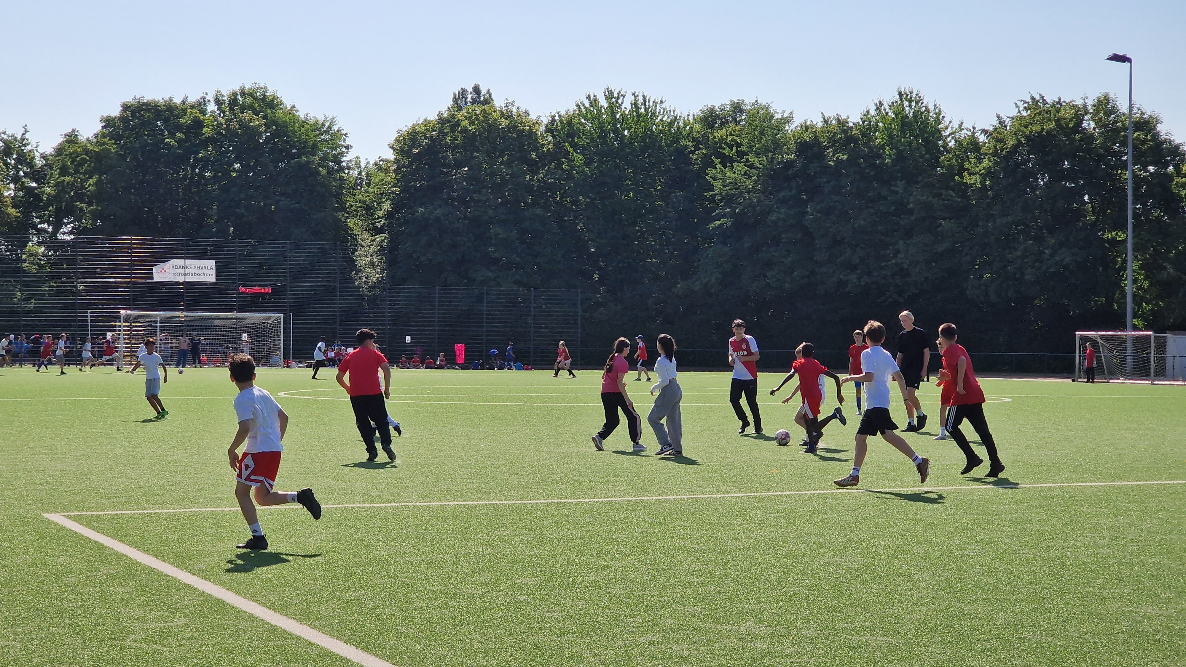 Von April bis September und bei trockenen Platzverhältnissen können unsere Schülerinnen und Schüler ihre Pause auch aktiv auf dem Sportplatz verbringen.